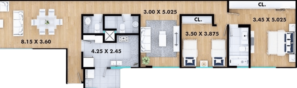 FLAT 502 Área: 136 m² 3 Dormitorios + 3 Baños + Sala + Comedor + Cocina + Lavandería
